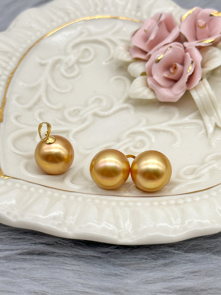 13.5-14mm Deep Golden South Sea Pearls Set of Stud Earrings and Pendant