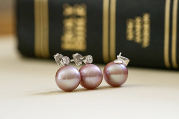 Lustrous, untreated, Pink Edison Freshwater Pearls Stud Earrings and Pendant in Sterling Silver settings.