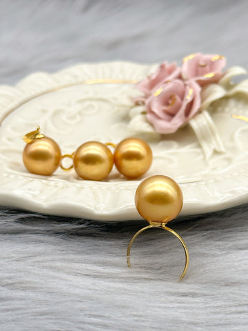Lustrous, untreated, Deep Golden South Sea Pearls Stud Earrings, Ring and Pendant in 14k Solid Yellow Gold settings.