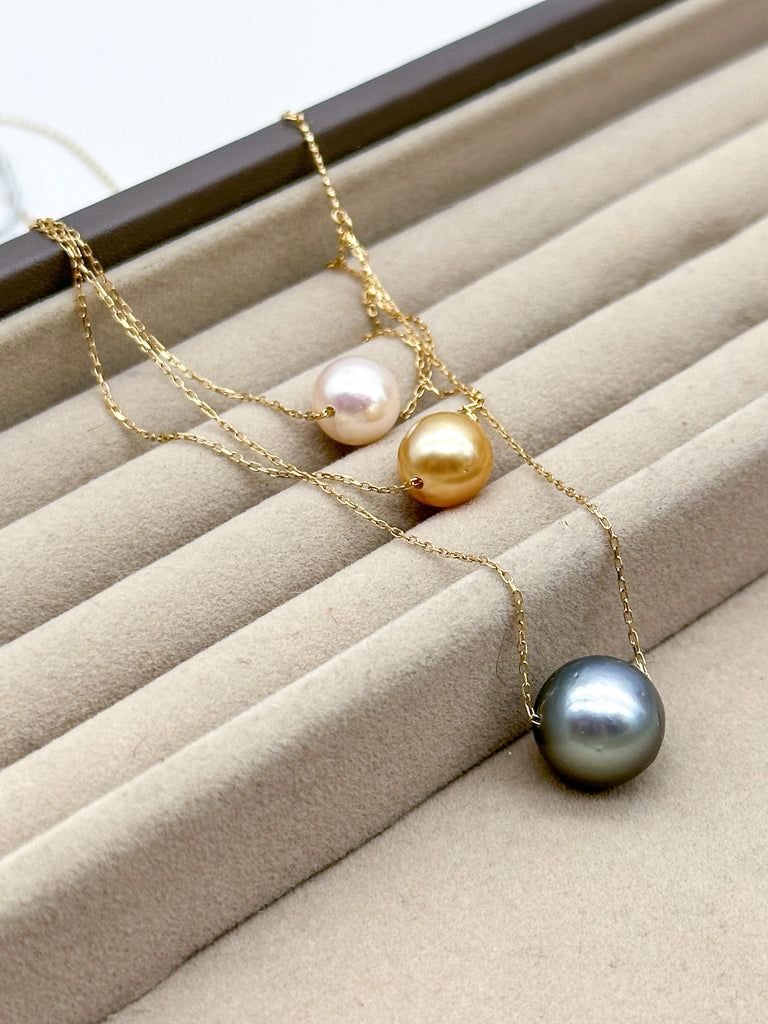 Discover this exquisite floating necklace featuring lustrous, untreated white Akoya, golden South Sea, and black Tahitian pearls! 🌊✨ With pearl sizes ranging from 8.5-12mm and a beautiful round shape, this necklace is elegantly complemented by an 18k Japan gold chain. Boasting excellent luster, it’s a stunning piece for any jewelry collection! 💖