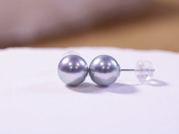 Dainty, lustrous, Blue Akoya Pearls Stud earrings in 18k Gold post and silicone with gold backing.