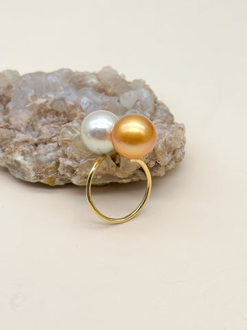 Lustrous, untreated, natural color South Sea Pearl Bypass Ring in 14k solid gold settings.