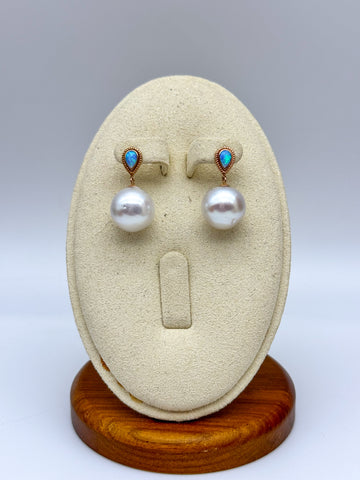 Lustrous, untreated, Silvery White South Sea Pearls Dangling Earrings with Natural Opal in 18k Solid Yellow Gold settings. It has silicone-coated backing.